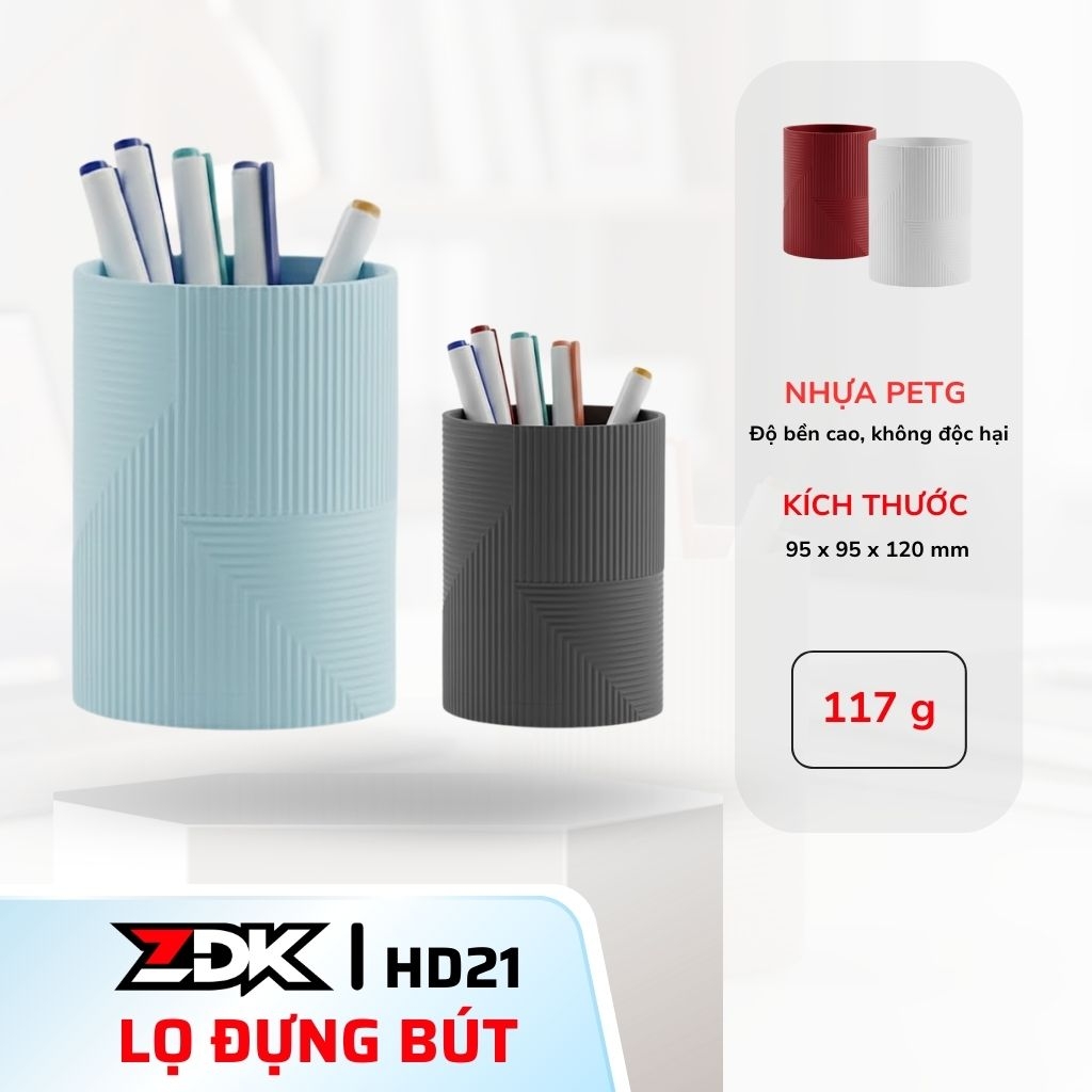 - Với kích thước 95 x 95 x 120 mm, HD21 có thể chứa nhiều loại bút, kéo, thước và các món đồ văn phòng khác mà không chiếm quá nhiều diện tích bàn.