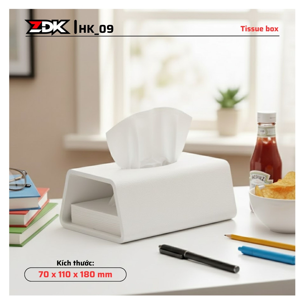 - Hộp đựng khăn giấy HK_09 sở hữu thiết kế tối giản với đường nét vuông vức, hiện đại, giúp không gian sử dụng trở nên gọn gàng và tinh tế hơn.