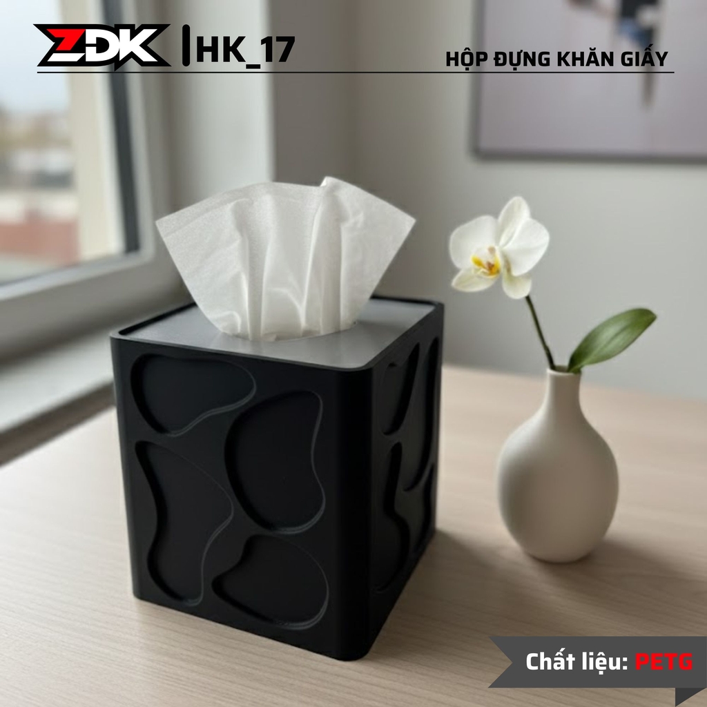 - Hộp đựng khăn giấy HK_17 nổi bật với thiết kế hình khối vuông hiện đại, bề mặt được tạo họa tiết uốn lượn độc đáo, mang lại điểm nhấn thẩm mỹ cho không gian sống.